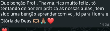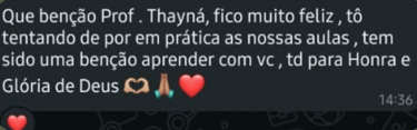 Você terá acesso a encontros em grupo ao vivo para tirar todas as suas dúvidas diretamente com a instrutora e interagir com outros alunos, e também o número do suporte ficará disponível para sanar quaisquer dúvidas.
